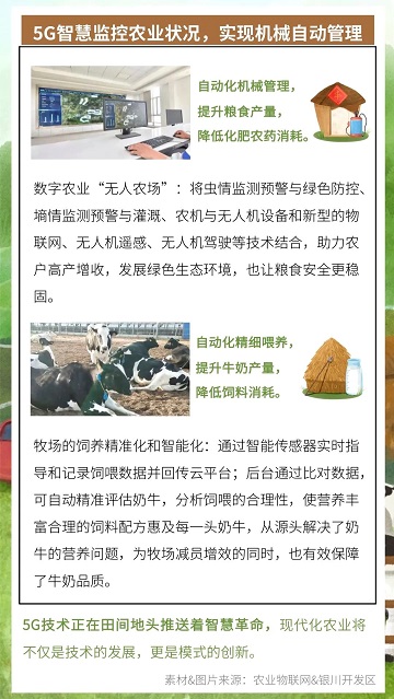 5G技(jì)術(shù)應用在農牧領域,通(tōng)過自動精準管理(lǐ),可(kě)以大(dà)大(dà)提升産量、降低(dī)農藥和(hé)飼料等的消耗。2020年,浙江的一塊試驗田産量提升了20%,用工成本減少(shǎo)了10%,化肥農藥消耗減少(shǎo)了8%;國內(nèi)某公司開(kāi)發的智慧畜牧雲系統,能夠全方位監控牛的營養、健康、環境、自動化飼喂、牧場(chǎng)管理(lǐ)等,提高(gāo)奶牛的繁殖效率和(hé)健康水(shuǐ)平。