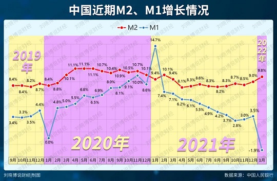 上(shàng)圖是最新的狹義貨币M1和(hé)廣義貨币M2同比增長率的走勢圖。在2022年1月,M1曆史性地第一次出現了負增長,跟M2的剪刀差拉大(dà)。